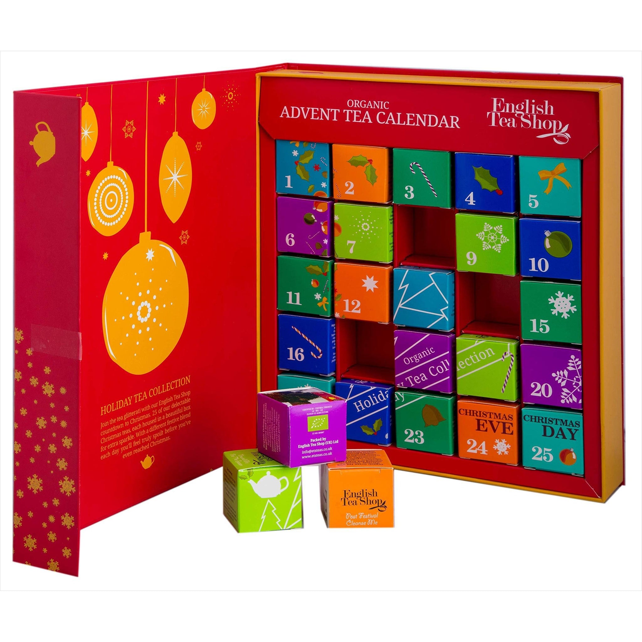 English Tea Shop Organic Book-Style Red Advent Calendar: Immerse yourself in the rich world of tea. This elegantly designed calendar houses 25 organic pyramid tea bags, each carrying a unique blend. Perfect for those who fancy a calming brew on a cold December morning.