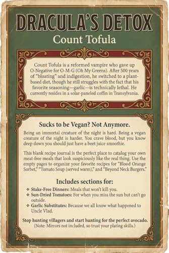 Dracula’s Detox By Count Tofula Features: A perfect Halloween gift for the kitchen witch. This notebook mocks the "Count Dracula" vibe, making it a great gift for goths and horror fans who love to cook healthy. It is a recipe journal disguised as a spooky book for the vegan vampire in your life.