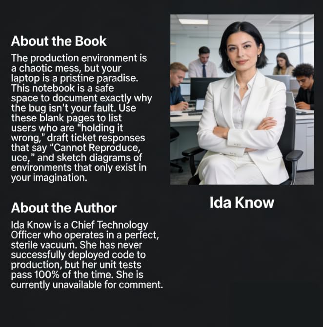It Works on My Machine By Ida Know Features: The ultimate Bingo gift for Developers. This notebook is full of common CTO lies and excuses like "It works on my machine." It is a hilarious gift for QA testers and engineers. A fake book that serves as a funny desk accessory for the coding team.