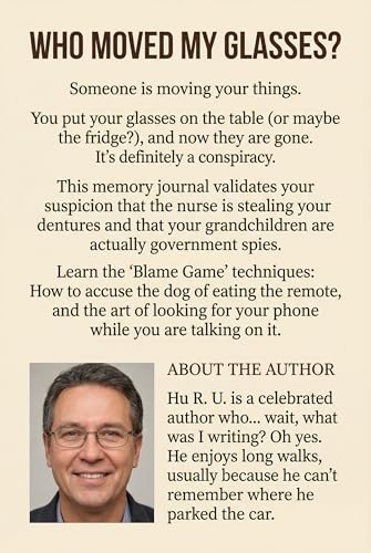 Who Moved My Glasses? By Hu R. U. Features: The perfect gag gift for the retiree or the "forgetful" parent. This fake book memoir about memory loss is a hilarious birthday present for Mom, Grandma, or Grandpa. It is a wide-ruled notebook they can actually use to remember where they put their keys or write down their grocery list.