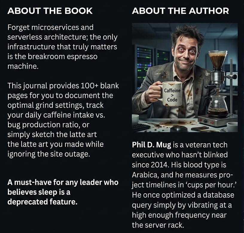 Powered by Java By Phil D. Mug Features: A great gift for the Java Developer. This notebook pairs perfectly with a coffee mug. It is a funny gift for backend engineers who turn caffeine into code. A fake book about "Coffee Machines" that makes a great addition to any programmer's desk.